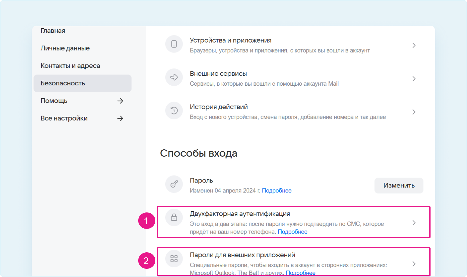 - Создать специальный пароль для внешних приложений в вашем аккаунте Mail.ru и подключить двухфакторную аутентификацию