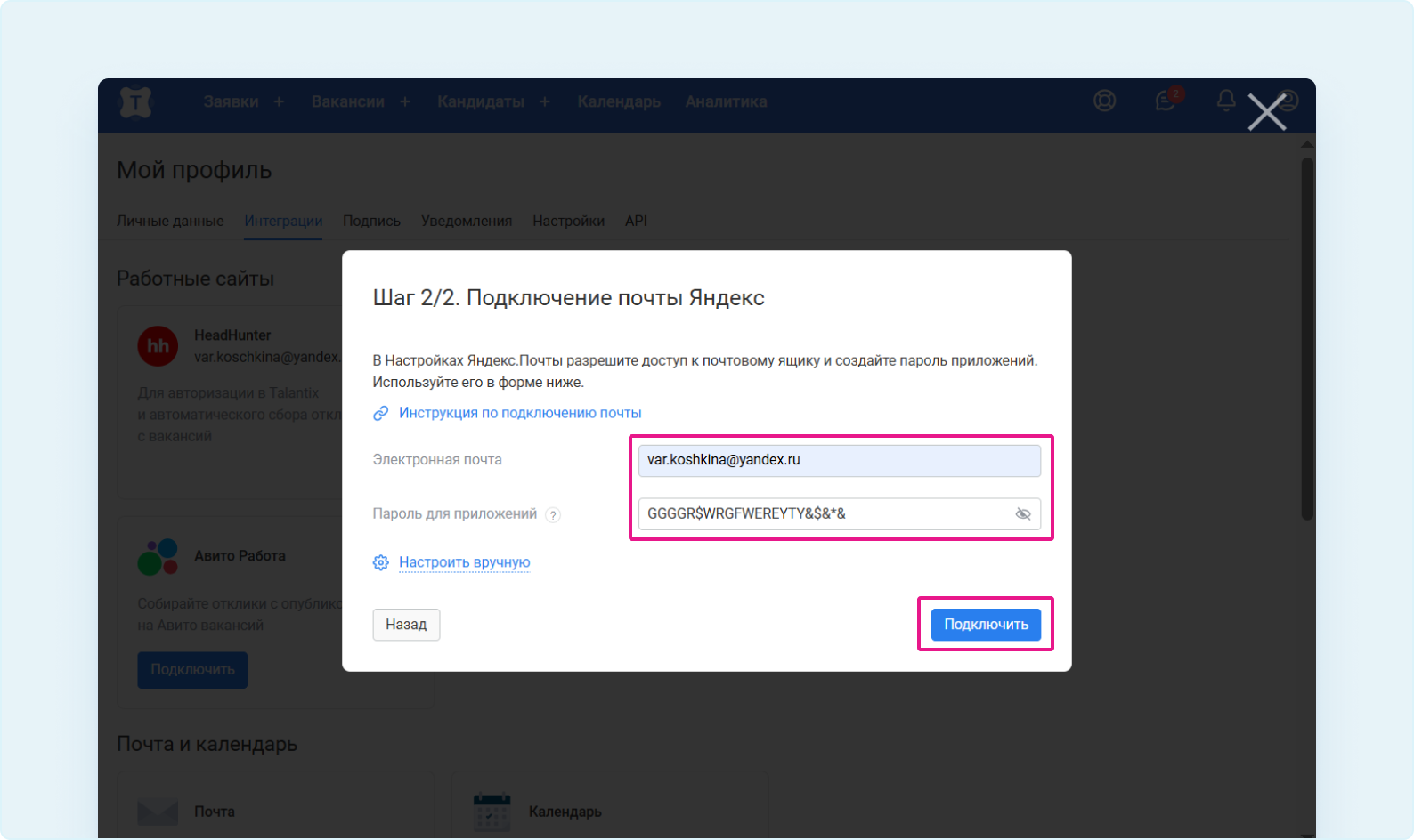 - Подключить ящик в разделе интеграций Talantix.