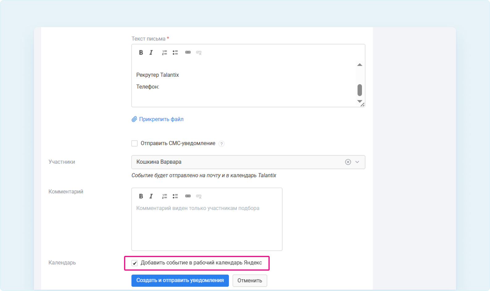 Чтобы уведомить кандидата о встрече по email, поставьте соответствующую галку.