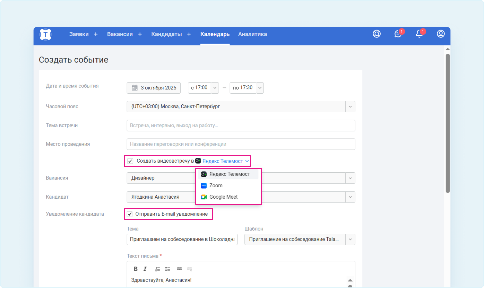 При создании встречи (из календаря или карточки кандидата) поставьте галку и выберите «Создать видеовстречу в Яндекс Телемосте».