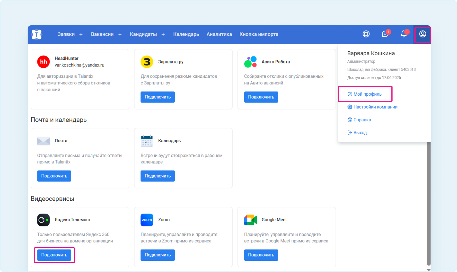 Шаг 1. Откройте вкладку «Мой профиль» → «Интеграции». В разделе «Видеосервисы» в блоке «Яндекс Телемост» нажмите «Подключить».