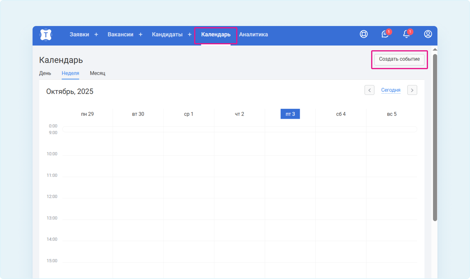 1. Для того чтобы запланировать встречу с кандидатом из раздела «Календарь», в правом верхнем углу нажмите на кнопку «Создать событие».