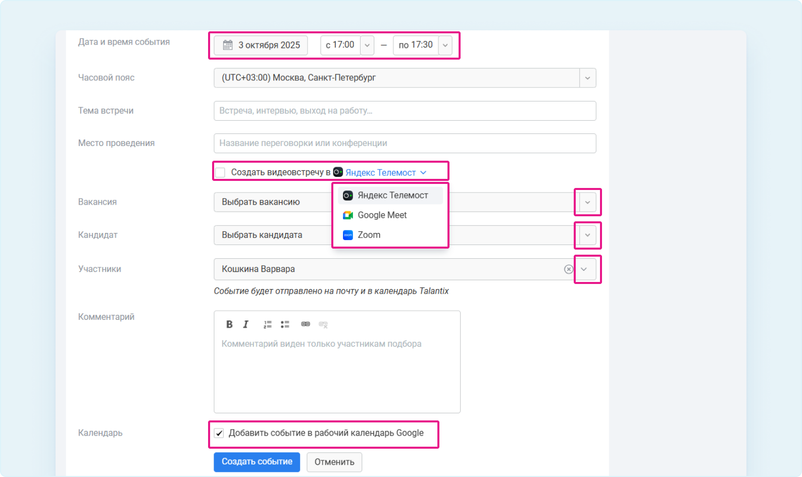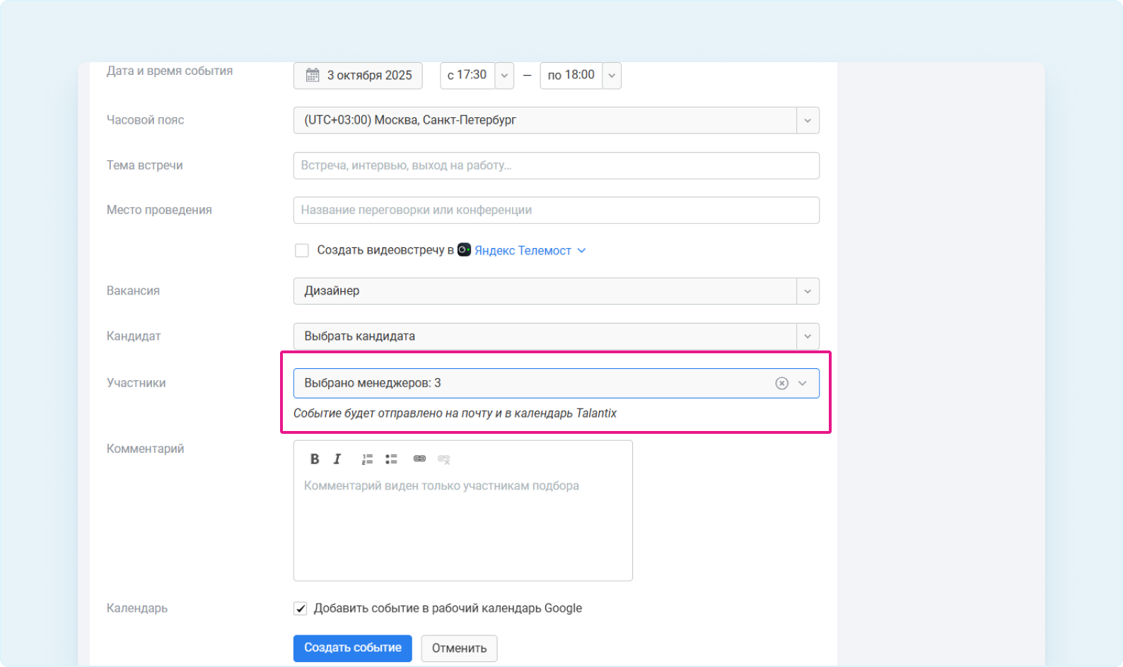 Можно создать событие и без отправки приглашения кандидату. Для этого оставьте строку «Выбрать кандидата» незаполненной.