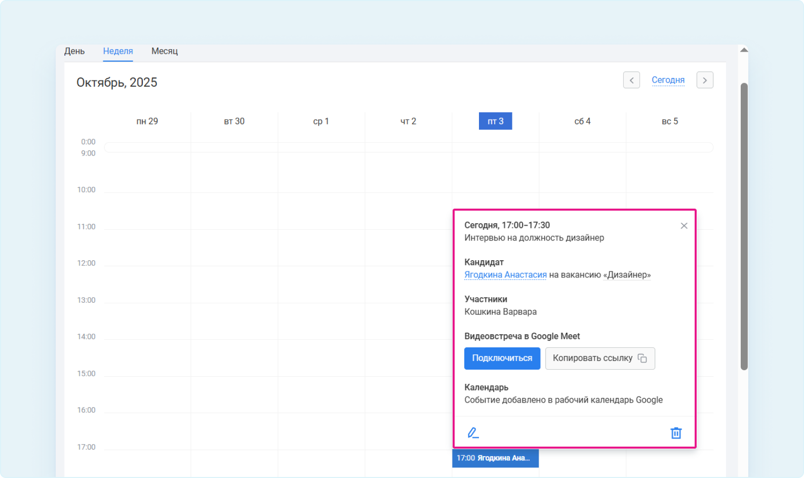 Из рабочего календаря вы сможете легко перейти по ссылкам на вакансию и резюме кандидата с кем запланировали встречу (исключение — в Яндекс Календаре ссылки не предусмотрены).
