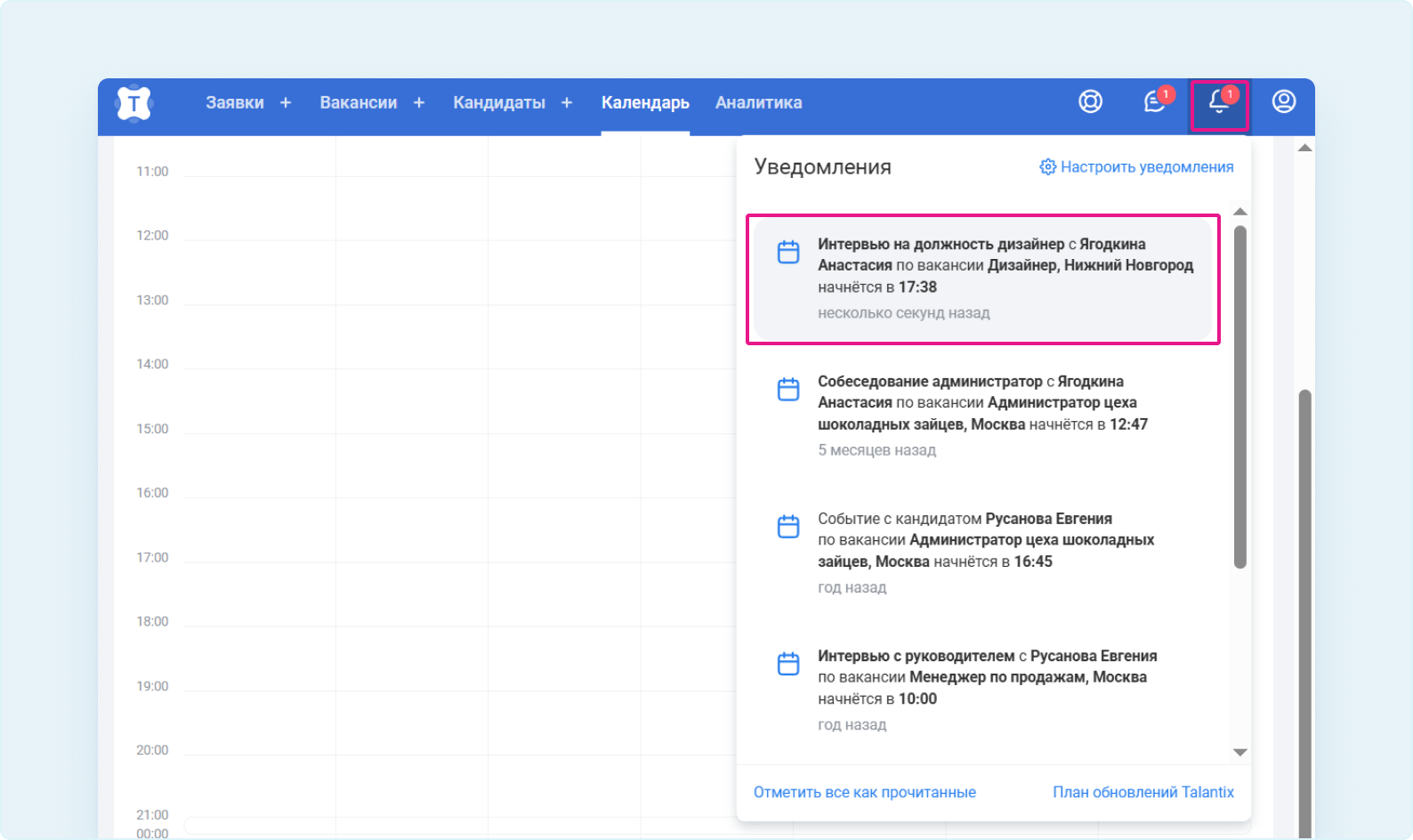 Календарь Talantix напомнит о запланированном событии за 15 минут до начала встречи в интерфейсе Talantix. Все уведомления о запланированных в разделе «Календарь» событиях можно найти, нажав на колокольчик.