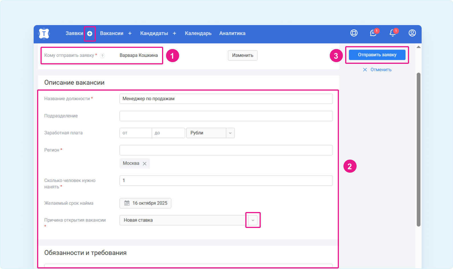 - желаемый срок закрытия вакансии: укажите в календаре дату, когда новый сотрудник должен выйти на работу.