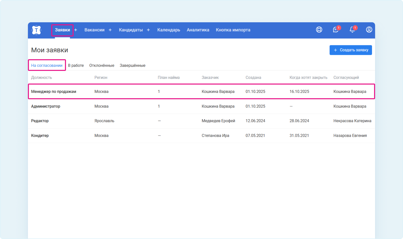 Ваша заявка появится в разделе «Заявки» — вкладка «На согласовании».