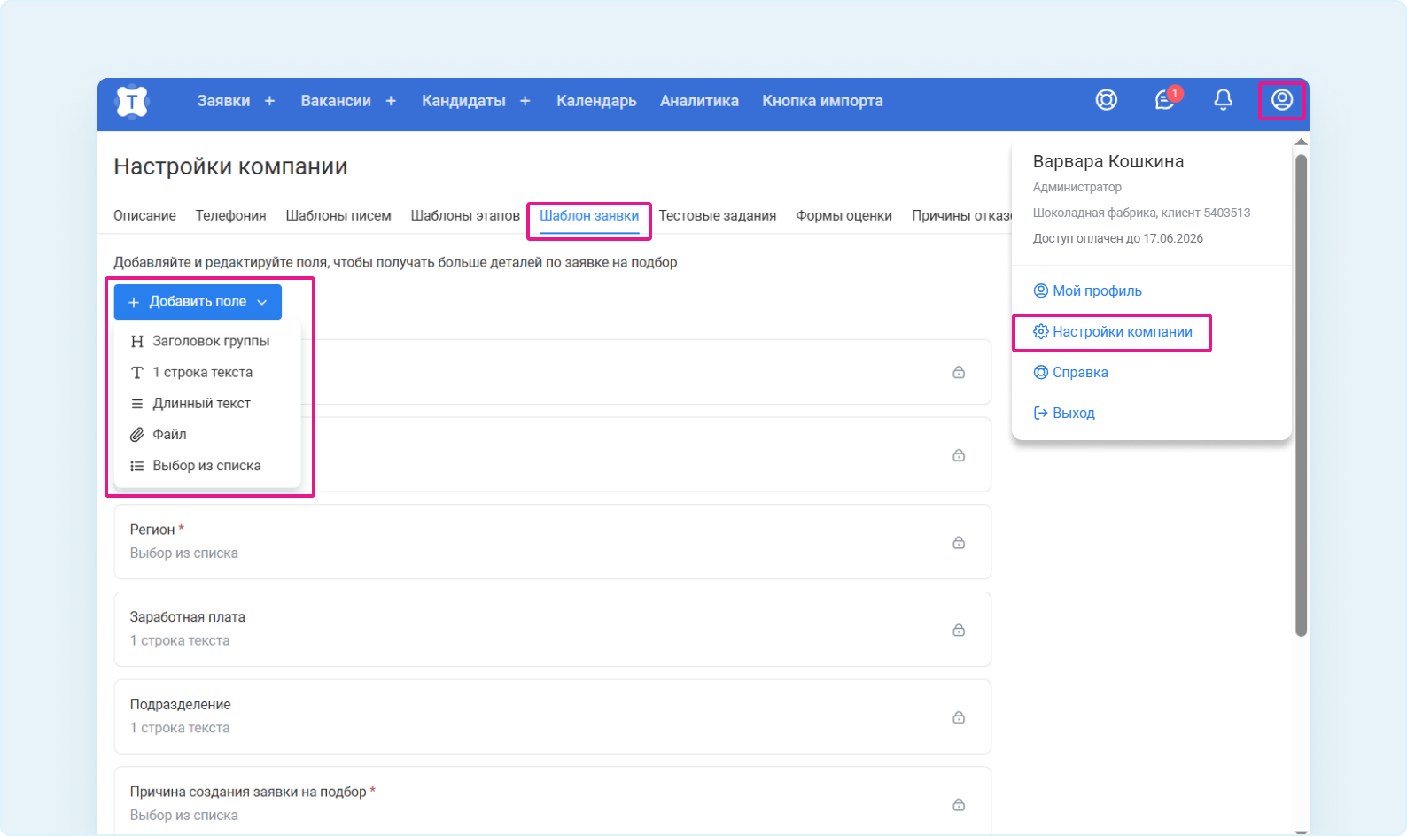 1. Зайдите в раздел «Настройки компании», вкладка «Шаблон заявки».