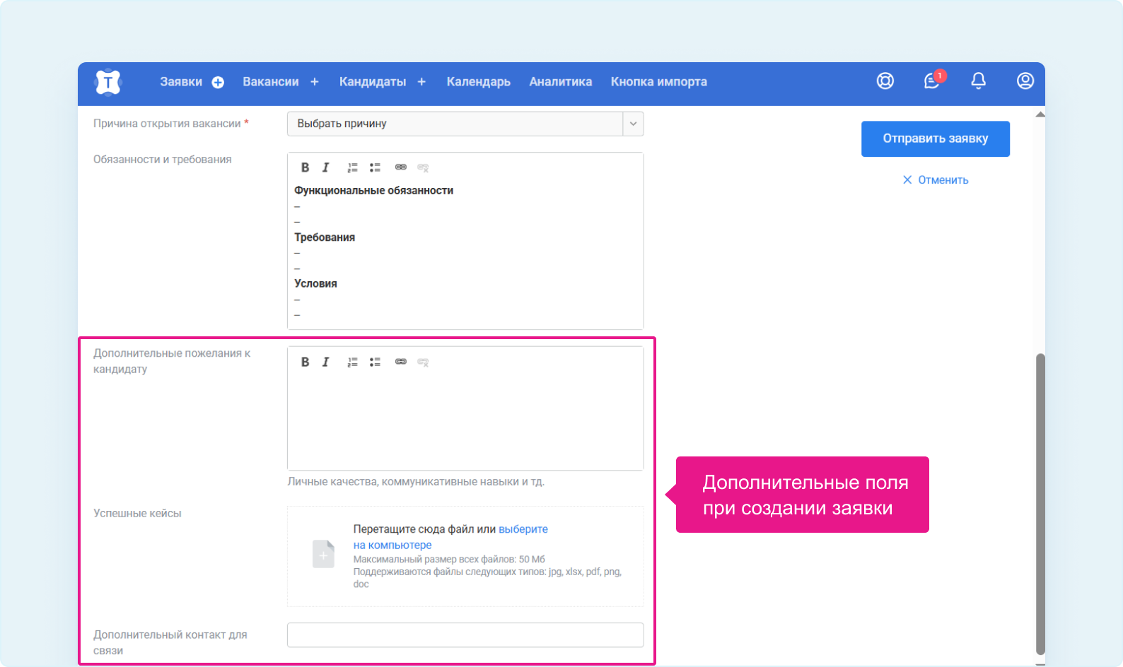 Настройте форму заявки под уникальные бизнес-процессы вашей компании. Собирайте детальную информацию о вакансии сразу на этапе создания заявки, экономя время на дополнительных согласованиях и уточняющих вопросах.