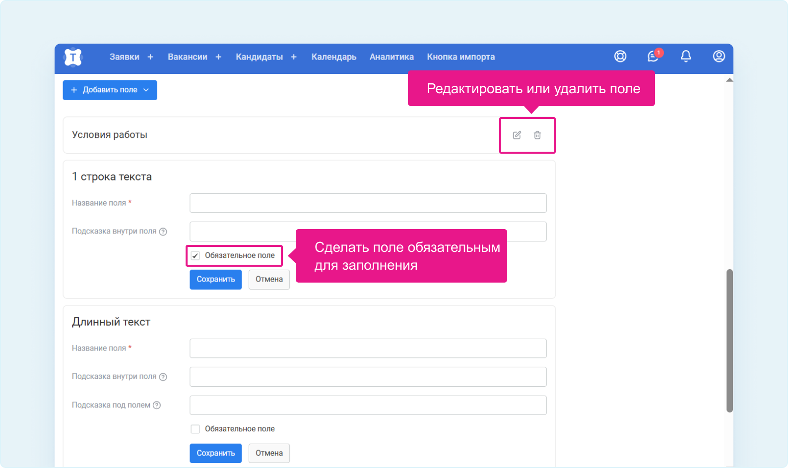 • Длинный текст — для развернутых описаний (информация о требованиях к кандидату, описание проекта). Можно добавить два вида подсказок: внутри поля(подойдёт для коротких подсказок) и рядом с полем (подойдёт для длинных подсказок).