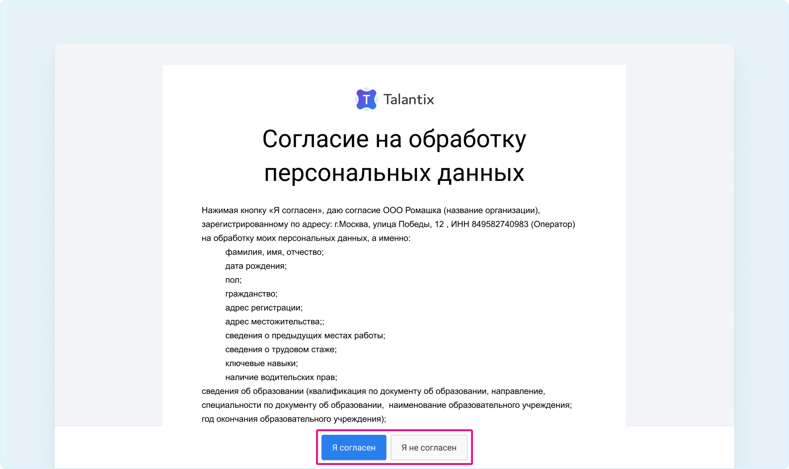 Talantix позволяет использовать вашу собственную форму согласия на обработку персональных данных. Это решение для компаний, которым важно настроить текст и срок действия согласия под свои внутренние правила.