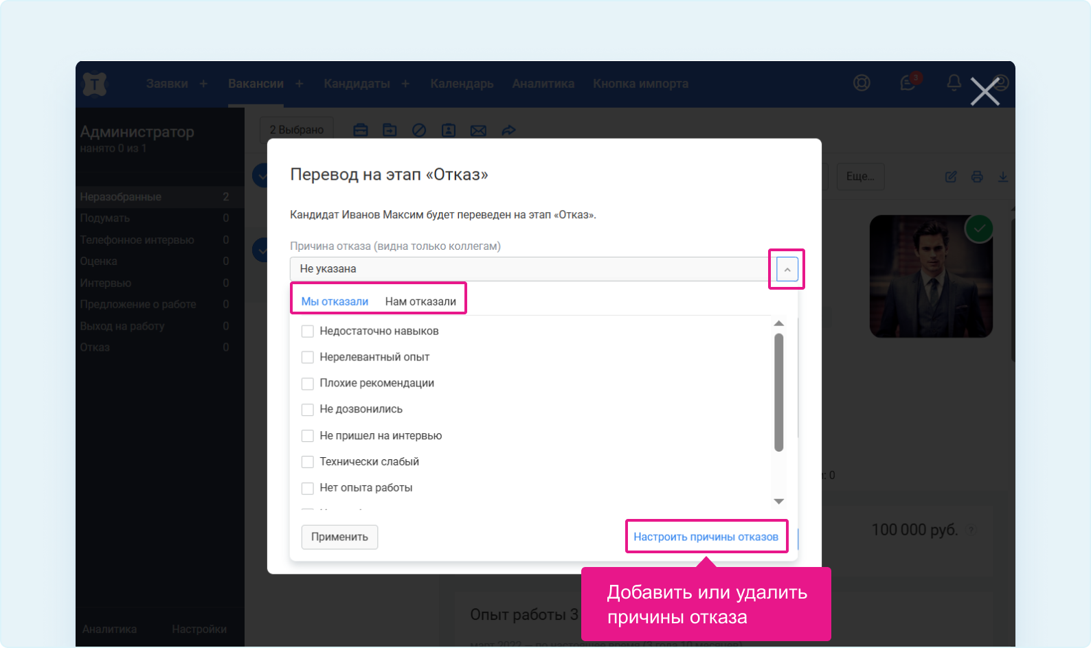 Если вы передумали: Вы можете в любой момент изменить этап кандидата с «Отказа» на любой другой, просто выбрав новый этап в выпадающем списке.
