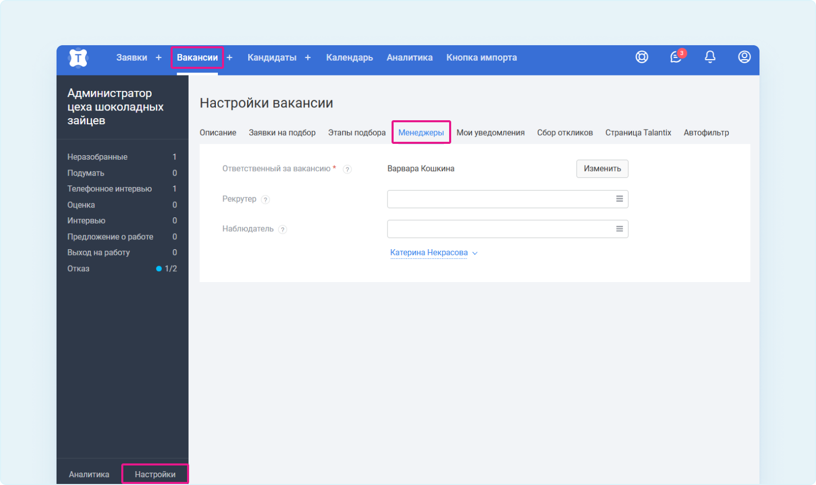 Чтобы проверить, назначены ли вы на вакансию, откройте её из списка во вкладке «Вакансии», перейдите в «Настройки» → «Менеджеры».
